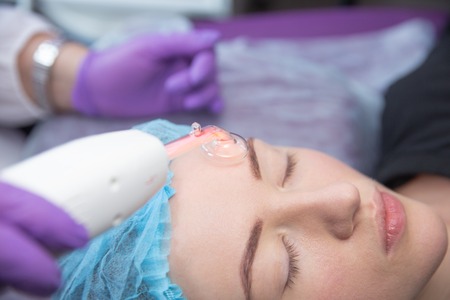 Young woman getting chromotherapy procedure for face skin rejuvenation