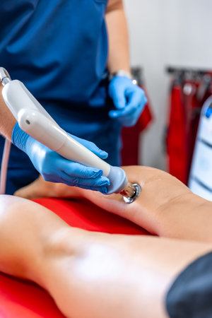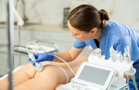 professional cosmetologist using ultrasound cavitation machine on a female buttock
