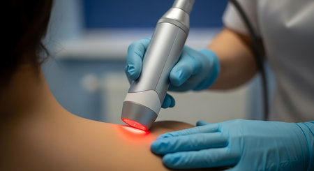 A close-up shows a laser treatment being performed on a shoulder. The device emits a red light. Blue gloved hands hold the laser.