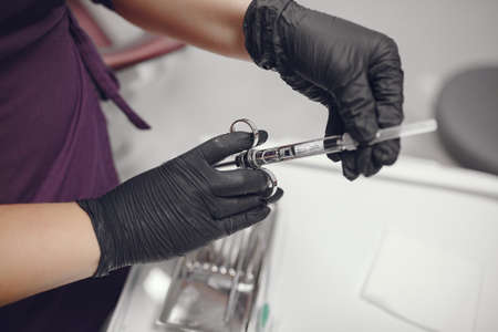 Close up of dentist hand with special tool for removing nerve from tooth. Dentist orthopedist tools. Surgical of instruments used in dental implantology.