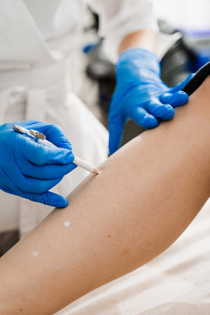 A dermatologist surgeon removes a neoplasm - a mole or nevus from the patients abdomen with a radio wave knife. Aesthetic surgery, prevention of melanoma.