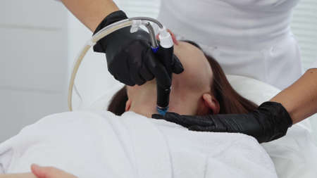 Middle aged beautiful Caucasian woman getting a facial aqua peeling, a rejuvenating treatment on her face in a wellness spa clinic. Dermatology and skin care concept
