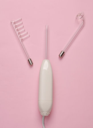 Device for local darsonvalization on pink background. Treatment of acne, problem skin. top view. flat lay composition
