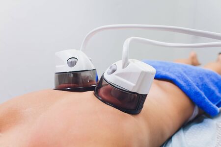 Vacuum massage. Medical procedure. The therapist massages the womans back.