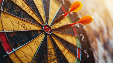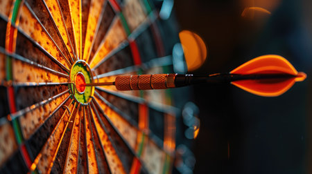 Dart hitting the bullseye on a dartboard with blurred background and dramatic lighting. Precision, strategy, accuracy, sports, leisure, competition, goal-setting, focus