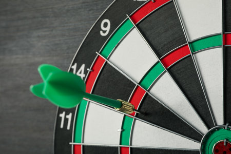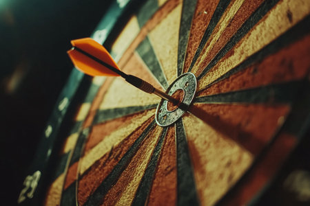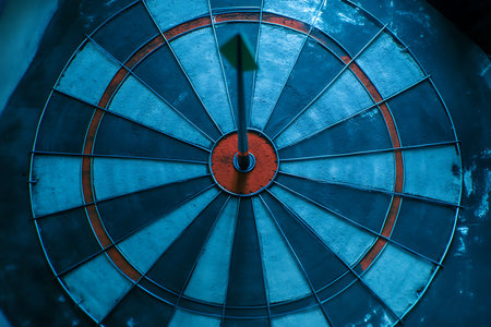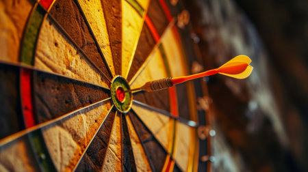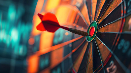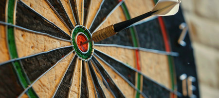 A close-up of a dart hitting the bullseye of a target, symbolizing precision and achievement of goals, with a blurred background for focus.
