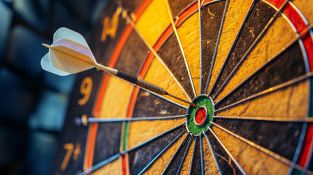 A dart hits the bullseye on a vibrant target, showcasing accuracy and focus. Perfect for illustrating games, precision sports, or competitive fun.