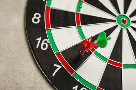 Close-up of a dartboard with arrows in the center.
