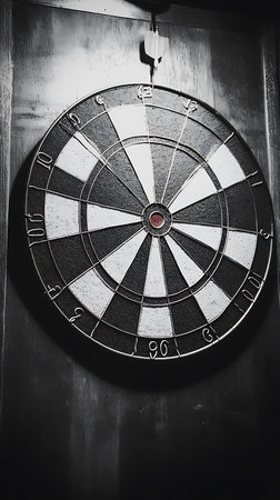 A close-up view of a dartboard with a dart stuck in the bullseye, against a textured wooden wall in black and white tone.