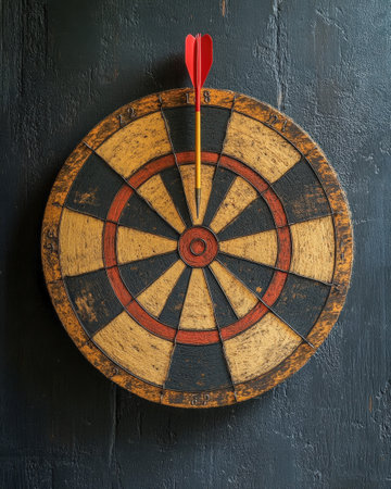 A red dart hitting the bullseye of a vintage-style dartboard with worn textures, symbolizing strategic focus and goal-setting in business