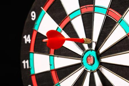 Dart hitting the bullseye on a dartboard. Business target or goal success and winner concept