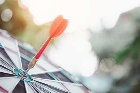 Close up shot of the dart arrow hit on bullseye, red dart arrow hitting in the target center of dartboard Target hit in the center, challenge in business marketing,Target and goal as concept.