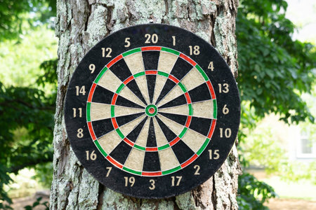 A closeup of a dartboard hanging on a tree trunk