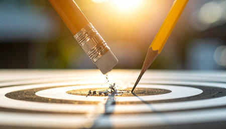 A pencil eraser removes a mark from a dartboard target with sunlight in the background.