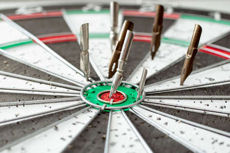 Close up image of a dart game in which one of the arrows hit the bullseye. A vibrant versatile image useful for competition, struggle, hard work, success, achievement, rivalry concepts.