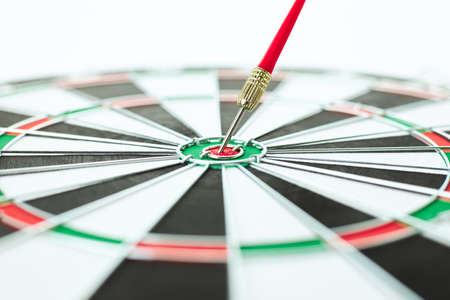 Red dart arrow hitting in the target center of dartboard on bullseye for Business focus concept.