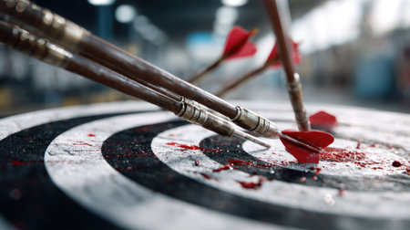A close-up view showcasing dart arrows striking the bullseye on a target in an indoor archery range, highlighting the intensity and focus of the sport.
