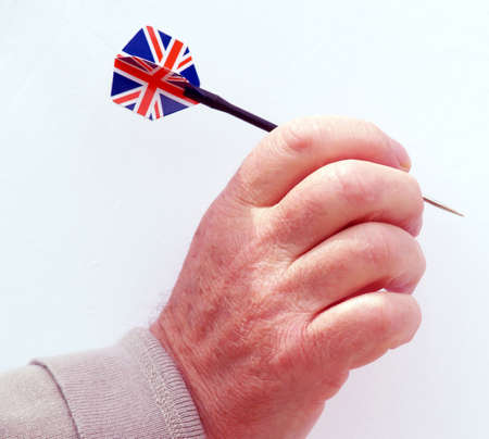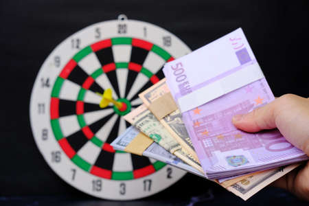 Business and finance concept. Darts with British and American flags are stuck in the darts.