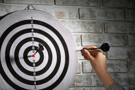 Setting goal or accurate planning, hand going to take dart into the center of sketching dartboard