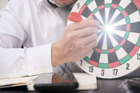 Businessman in white shirt sitting at the table with a dart board in his hand. Business concept