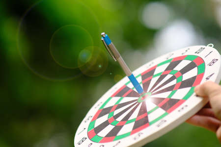 Business education success and target concept. Close up a hand is targeting the green dart arrow towards the center of dartboard. hit target. Success in business.