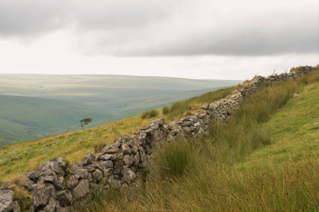 A view of a dry stone wall in the countryside of the Yorkshire Dales.