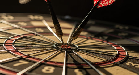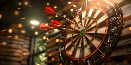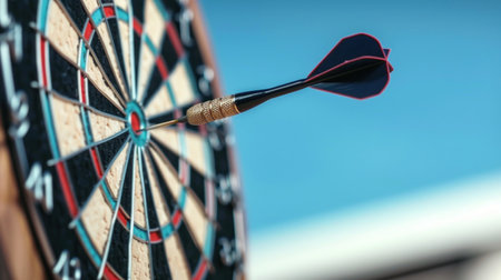 Close-up image of a dartboard with a dart hitting the bullseye. Concept of accuracy, precision, goal achievement, target focus.