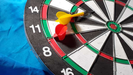 Red darts embroidered on the Dartboard on white background with orange light. Dart in the bullseye. Goal-oriented concepts, planning, and marketing strategies.