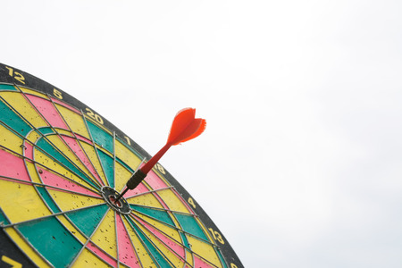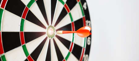 Red dart hitting a target on center of Bullseye or Dartboard. Business, competition, goal, success and marketing concept