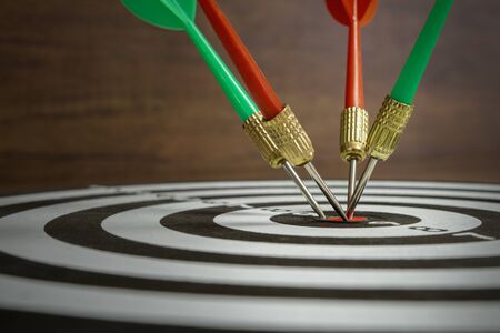 Red dart arrows hitting in the target center of dartboard. Success hitting target aim goal achievement concept