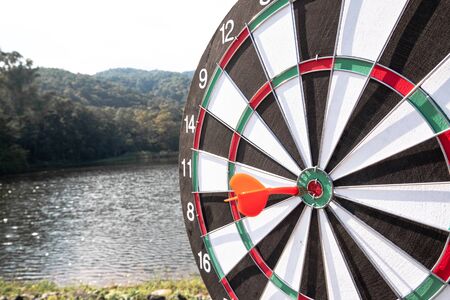 Dart arrow hit on bulleyes of dartboard with water background, Planning new business target and goals.
