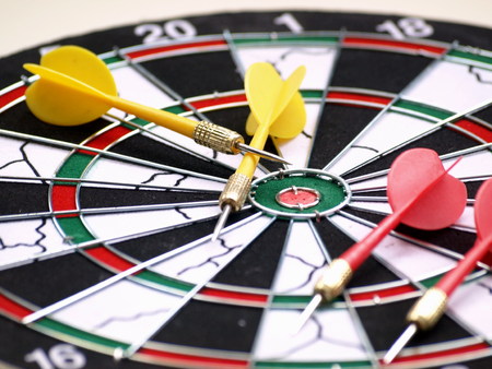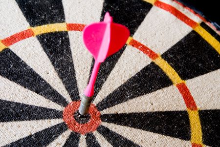 Concept of challenge in business marketing bullseye and intelligent customer reaching. The dart is the strategy or skill. The dartboard is the target or goal.