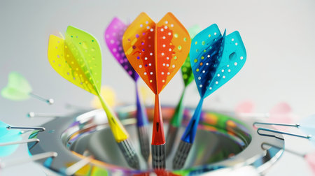 Colorful darts in a sparkling metallic dartboard. Concept of precision, target practice, recreational game, vibrant design.