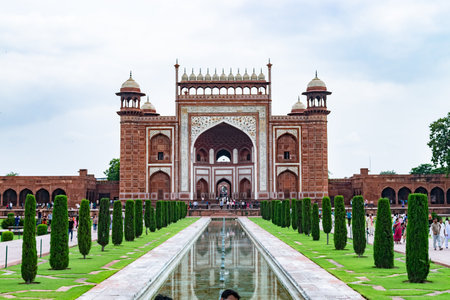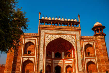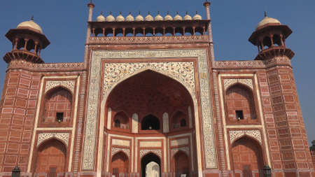 Taj Mahal. Entrance gate made of red brick. Agra, India