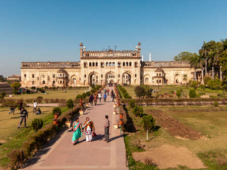 Lucknow, Uttar Pradesh, India - February 2015: Tourists taking a walk while sightseeing in the Mughal gardens of the ancient Bara Imambara complex.