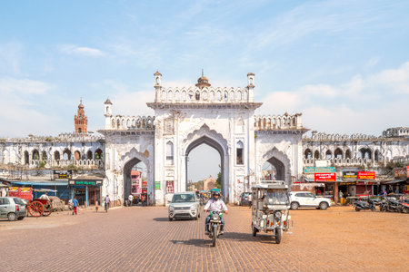 Lucknow, India - March 16, 2024: The image shows the historic Pehla Phatak gate of the Chota Imambara area with arched entrances, flanked by shops with colorful signage, parked cars, motorcycles, an auto rickshaw, pedestrians, and a red cart under dayligh