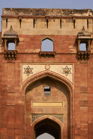 DELHI, INDIA - JANUARY 7, 2009: Fortified entrance to the historic Mughal fort of Purana Qila in Delhi India. 16th Century AD.
