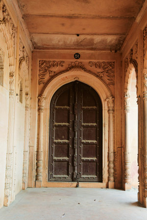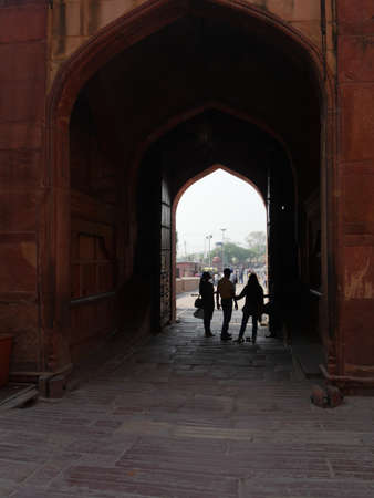 Agra, Uttar Pradesh, India- March 2018: Silhouette of people standing under the arches at Agra Fort.