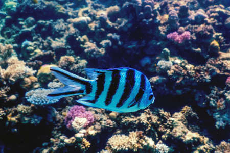 Scissortail sergeant fish (Abudefduf sexfasciatus) striptailed damselfish underwater, Tropical waters, Marine life