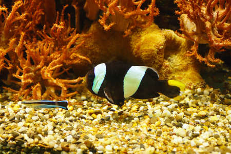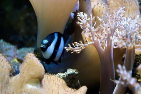 Beautiful black-white Ocellaris clownfish (Amphiprion ocellaris), also known as the Clown anemone among the underwater coral reef