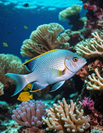 Explore the vivid underwater world through a captivating image of colorful fish interacting gracefully in a vibrant coral reef ecosystem.