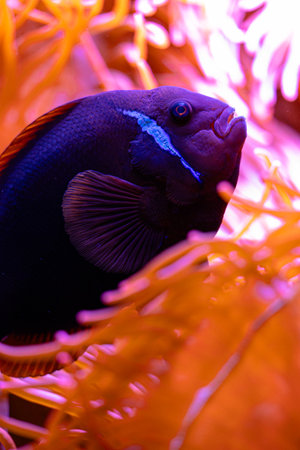 Purple clownfish hiding in the anemone in aqarium. Underwater scenery with fish.