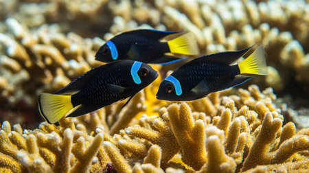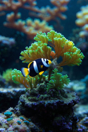 A striking yellow and black striped fish glides gracefully through a vibrant coral reef, showcasing the beauty and diversity of marine life. The scene captures the essence of underwater ecosystems and highlights the importance of ocean conservation.