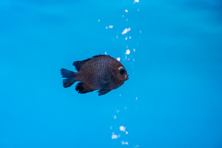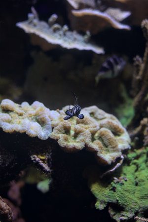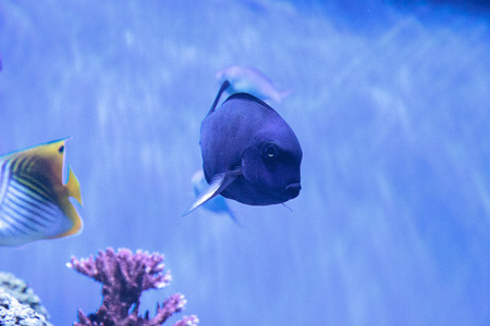 Neoglyphidodon melas in aquarium fish tank. It is also known as bowtie damselfish, black damsel, bluefin or royal damsel.
