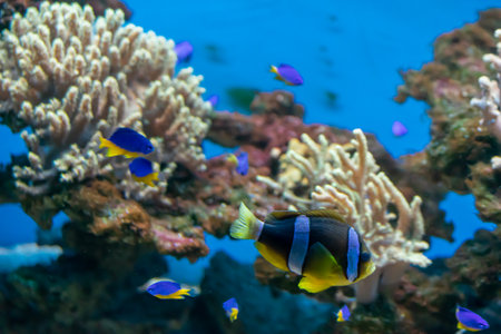 Tropical fishes and corals in the tank of an aquarium seen up close