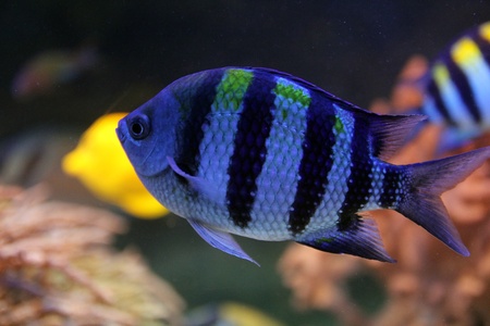 Small fish with yellow and black stripes swimming in aquarium in zoo.