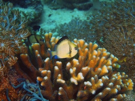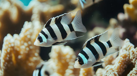 Experience the beauty of underwater life with two striped fish swimming gracefully near vibrant coral reefs in a tropical paradise, showcasing nature's stunning creations.