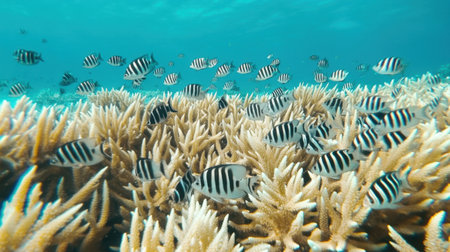 A stunning underwater scene featuring striped fish swimming gracefully above a vibrant coral reef, illustrating the beauty and diversity of marine ecosystems in their natural habitat.