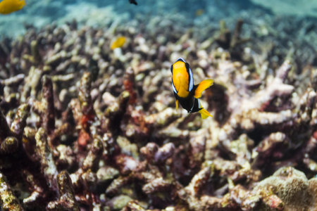 Yellow-tailed clownfish (Amphiprion clarkii) from the Pomacentridae family swimming in the coral reef