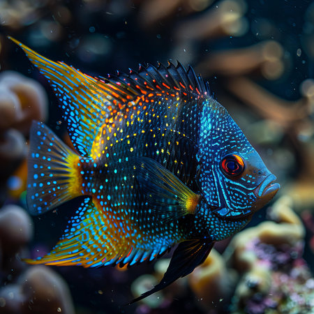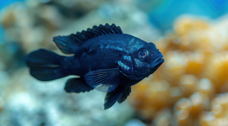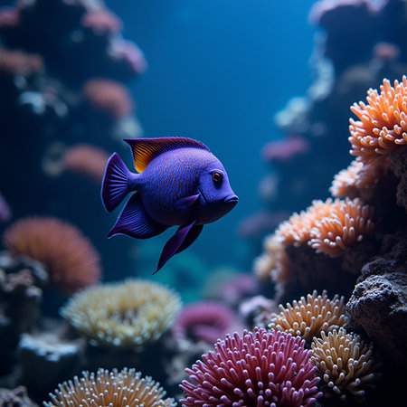 A striking blue fish is captured swimming near coral formations in an underwater environment. The image features a cool color palette with the fish's textured scales contrasting the soft, warm tones of the coral. This composition highlights natural beauty and is suitable for various commercial uses.